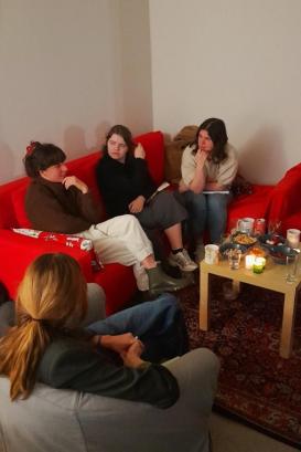 Met een groepje van acht nemen we plaats in zeteltjes op zolder. Eva en Fien hebben er alles aan gedaan om het gezellig te maken. Ze bieden me een drankje aan en voorzien snacks in het thema ‘vuur’, zoals rode radijsjes en snoeptomaatjes.